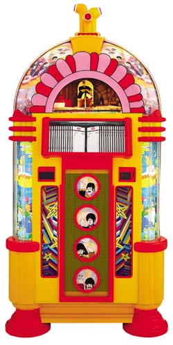 2001 Edition of only 100 Jukes made; serial number 90031; very small production, very rare machine. The Limited Edition Juke was approved for production by the Beatles company, Apple Corps, Ltd and features the psychedelic mis-en-scene of the Beatles movie. Specs: digitrack horizontal 100 cd mechanism, Sybersonic computer System, 360watt dual stereo amp (800watt peak), Surround sound System with DVC Sub, and 2 4″ two way coax midrange/tweeters, auxiliary music inputs and outputs, 25 cent coin acceptor, handcrafted cabinet, die cast metal trim and or course the tripped out graphics.